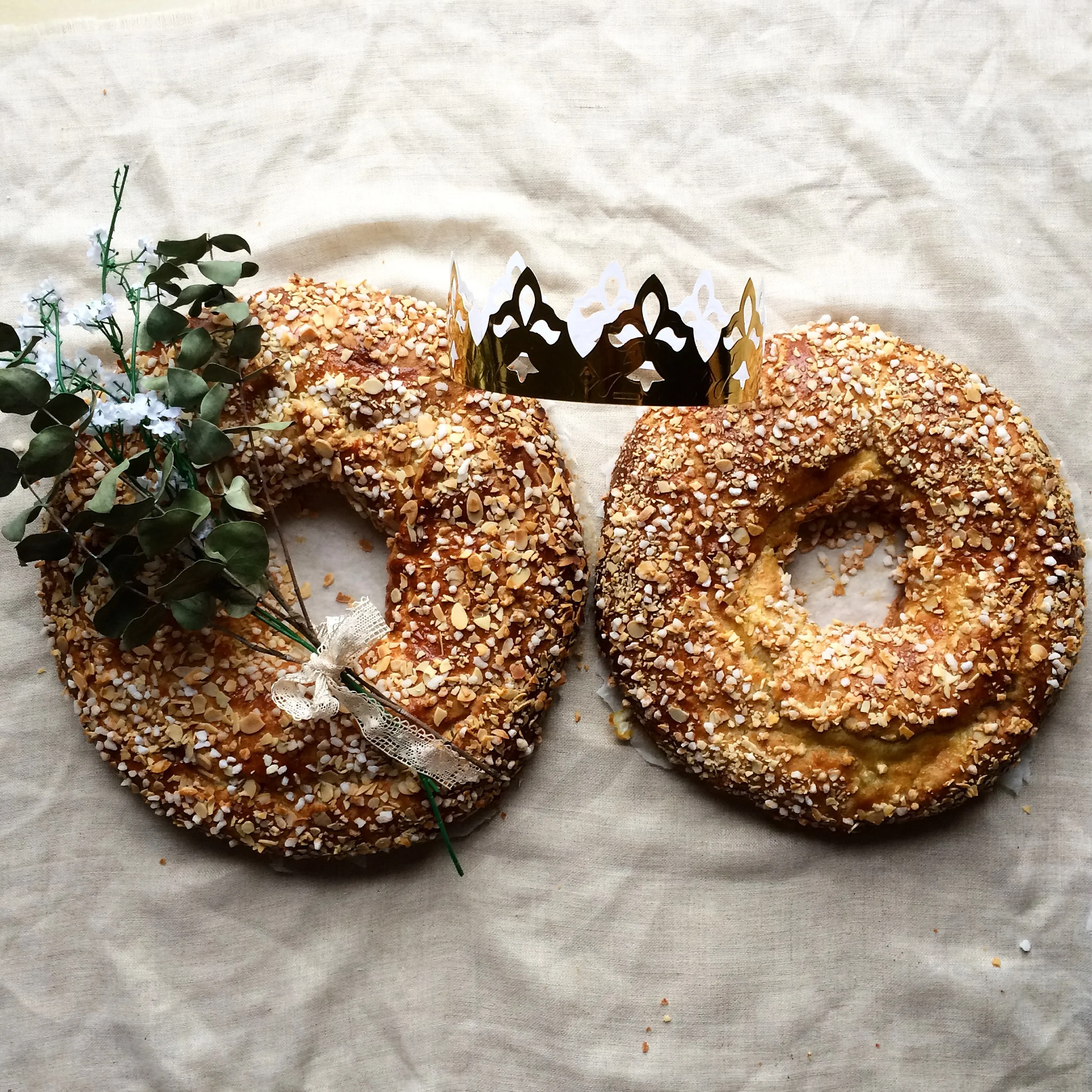 Ingredients: flour, eggs, sugar, butter, fresh yeast, orange blossom water, almonds, pearl sugar